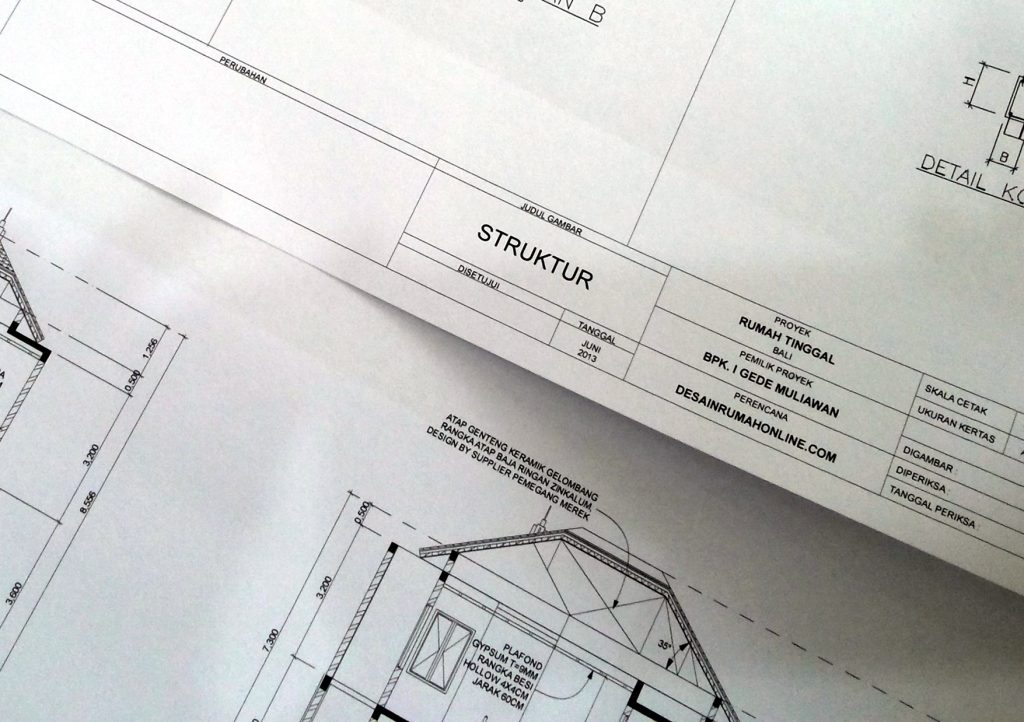 - Gambar kerja lengkap : Denah, tampak, potongan, struktur pondasi – kolom – balok – pembesian, plumbing, listrik, kusen – pintu – jendela & detil-detil pendukung.