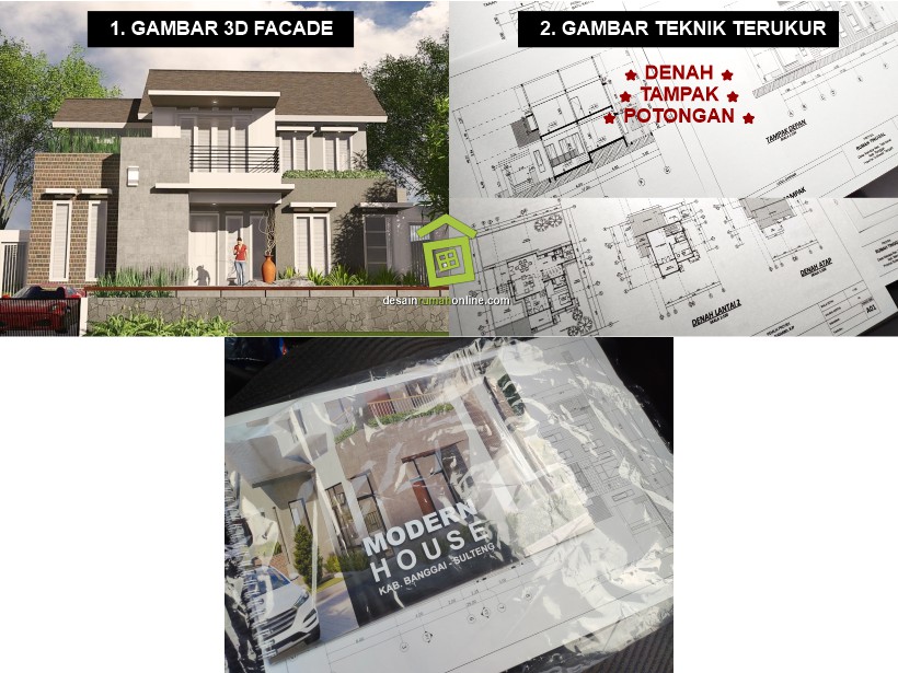 - Gambar kerja / teknik lengkap : Denah, tampak, potongan, struktur pondasi – kolom – balok – pembesian, plumbing, listrik, kusen – pintu – jendela & detil-detil pendukung.
