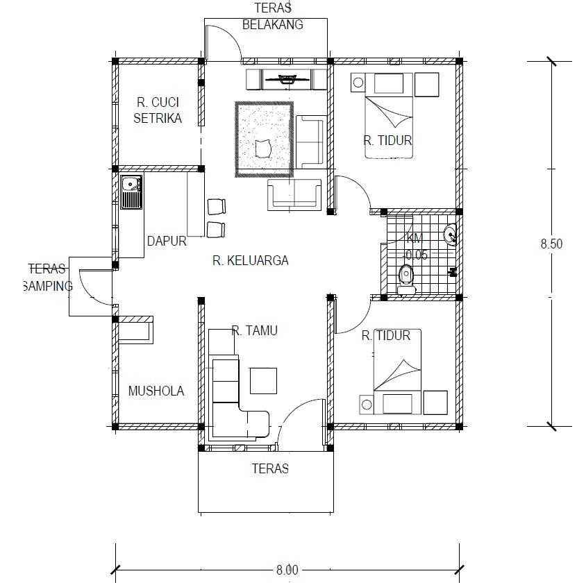 - Ruang keluarga di bagian tengah yang menjadi pusat interaksi.