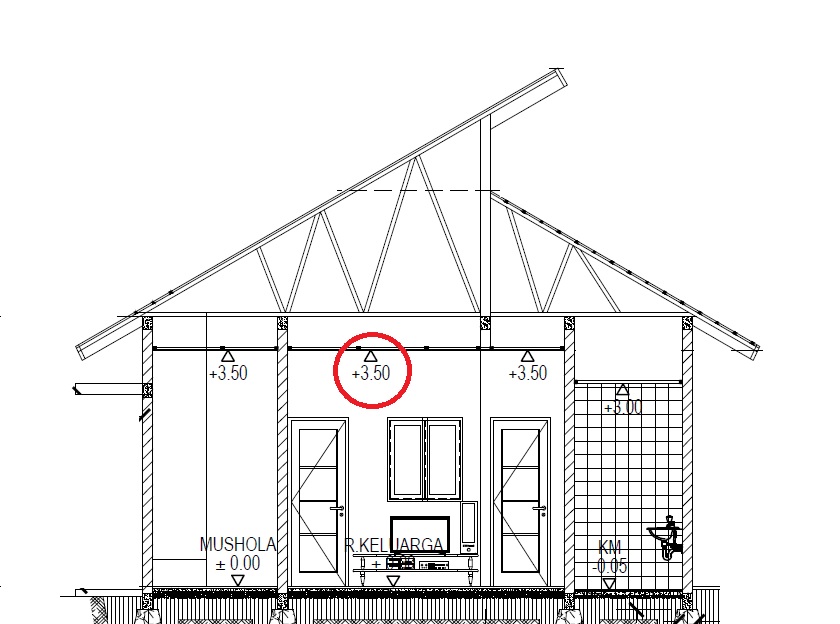 Desain ini menggunakan plafon setinggi 3,5 meter, lebih tinggi dari standar rumah pada umumnya. Plafon tinggi memiliki banyak manfaat. Selain membuat rumah terasa lebih megah dan lapang, ia juga memperbesar volume udara dalam ruangan, sehingga suhu di dalam rumah cenderung lebih stabil dan adem meskipun tanpa AC.